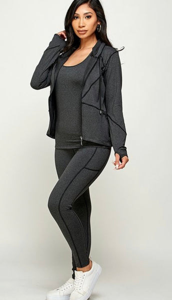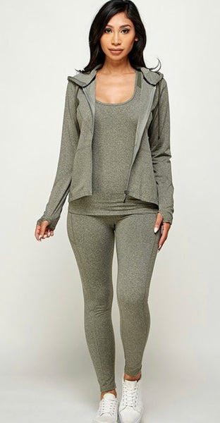3 Piece set featuring a zip up Hoodie, fitted Tank top, and matching leggings, with side solid cell phone pockets.